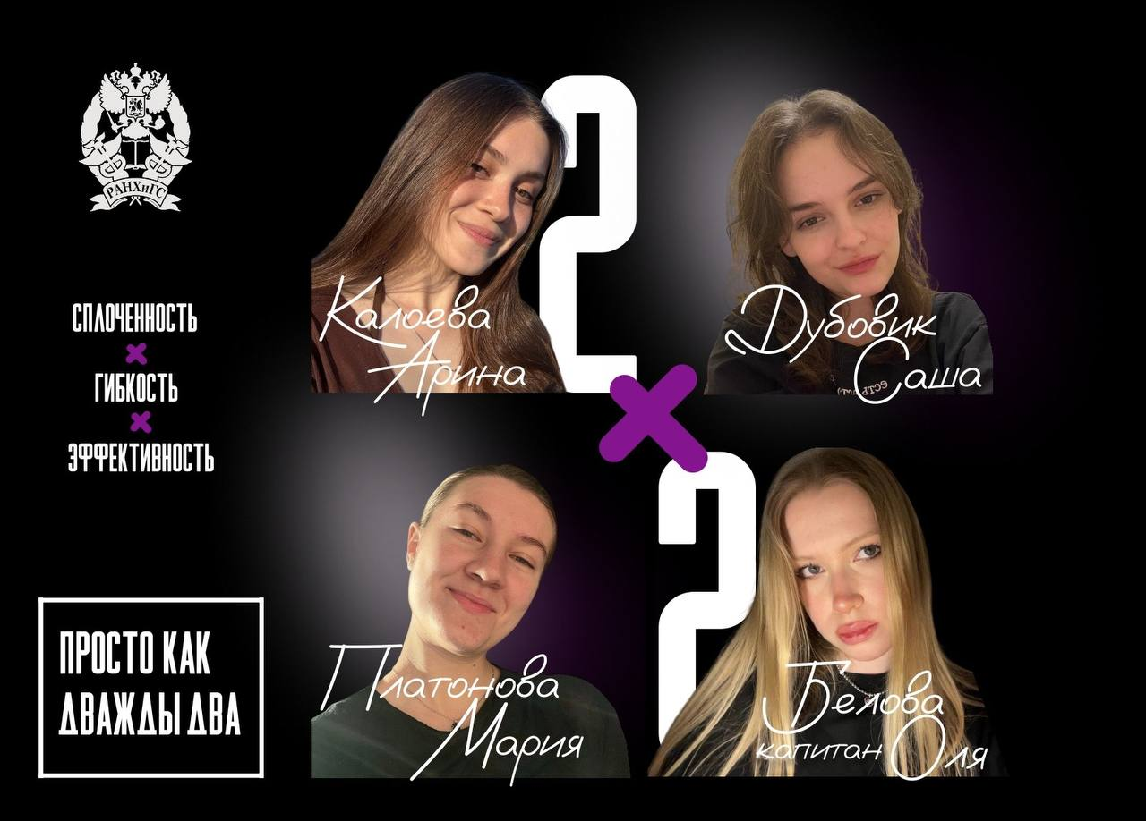К нам присоединяются те, кто доказывает: для крутого результата не нужен большой состав, достаточно четырёх единомышленниц! Встречайте: команда «2х2» из Северо-Западного института управления РАНХиГС.